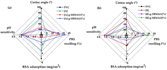 Figure 13 shows the main characteristics of the synthesized grafted materials: swelling in body conditions (pH 7.4 and T 37 °C), contact angle, pH sensitivity, and protein adhesion. The SBMA grafted materials presented similar characteristics depending on the percentage of grafting, with the materials with approximately 23% SBMA being the ones that showed less protein absorption and higher hydrophilicity. The [PVC-g-4VP (4%)]-g-SBMA (13%) catheters represent the best option as antifouling materials since they demonstrated less protein absorption and a lower grafted percentage.