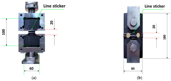Grip-specimen assembly showing the line sticker gage location for optical measurement (unit: mm): (a) TWT test; (b) WT test.