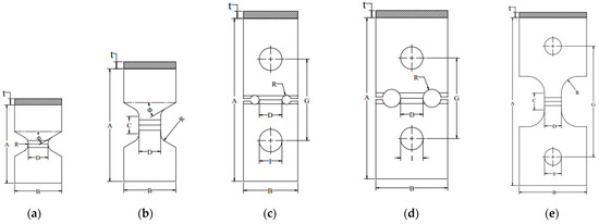 Shape and relative dimensions: (a) Type A TWT specimen (t < 25 mm); (b) Type B TWT (t ≥ 25 mm); (c) Type A WT specimen (t < 25 mm), ≤ 160 mm; (d) Type A WT (t < 25 mm), ≤ 160 mm; (e) Type B WT (t ≥ 25 mm).