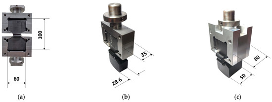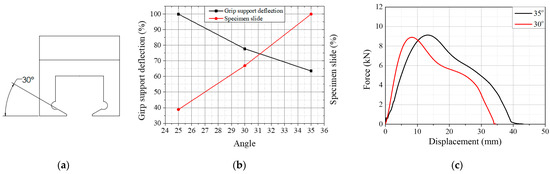 The finite element result of the gripping is shown in Figure 4b for the support angle between 25° and 35° [38]. The grip support angle of 35° provides significant specimen slipping while the support angle deflection is the smallest under the tensile load. And vice versa with a 25° angle. That is, the larger the grip support angle, the more is the specimen slips but smaller the grip deflection under the tensile load. Therefore, a grip support angle of 30° was chosen to provide an optimum design for resistance against specimen slippage and gripping instability.