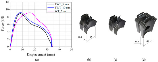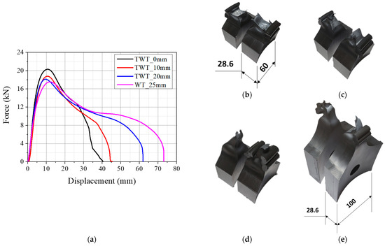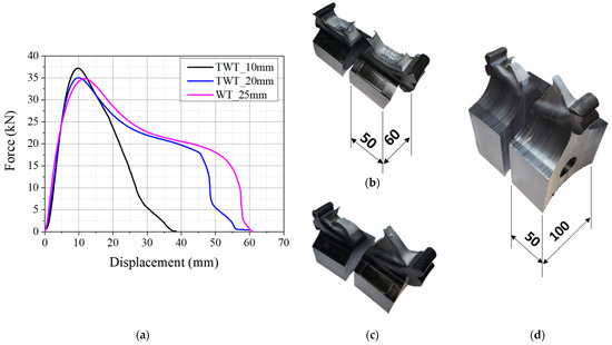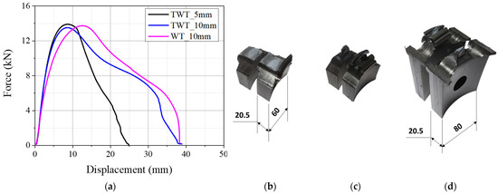 Figure 4c illustrates the experimental load–displacement curves of TWT specimens with grip support angles 30° and 35°. The load–displacement behavior is similar, but the 35° grip support angle exhibits a larger displacement at maximum load by about 55% than at 30°.