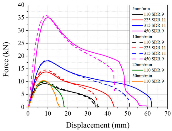 The effect of crosshead speed was investigated to determine the optimum test speed for the TWT specimen. Type A (110 SDR 9, 225 SDR 11) with fusion zone notch radius of 10 mm, and Type B (315 SDR 11, 450 SDR 9) having 20 mm parallel side length specimens were tested. Two crosshead speeds were used, 5 mm/min, and 10 mm/min. First, 5 mm/min was chosen as this speed is used in testing WT specimens per ISO 13953. Next, 10 mm/min was tested to see if the test time could be reduced. The higher speeds were not considered as 25 mm/min, and 50 mm/min noticeably reduced the elongation of the 110 SDR 9 TWT specimen, and much of the post-necking behavior differed compared to the 5 and 10 mm/min speed shown in Figure 6. However, the load–displacement curves of all sized TWT specimens are similar at 5 and 10 mm/min test speeds (Figure 10). In addition, although some reduced elongation with 10 compared to 5 mm/min speed, most of the post-necking behavior was retained to be similar at both speeds. Therefore, for the TWT dimensions given in Table 1, test speeds of 5 or 10 mm/min are suitable.