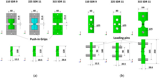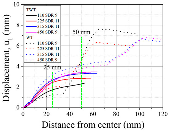 It is noted that based on the FE analysis, the 20 mm gauge length was selected for TWT and WT tensile tests (Figure 2). As shown in Figure 20, the change in displacement between the TWT and WT specimens is less than 5% for all specimen sizes when using a 20 mm (±10 mm) gauge length. Therefore, as expected, the experimental load–displacement curves measured with the extensometer are practically identical between the TWT and WT specimens at displacements up to 10 mm for the 110 SDR 9 size and up to 20 mm for the larger size, as presented in 3.3.2. In addition, the EN 12814-7 standard requirement to use an extensometer with a 50 mm (±25 mm) gauge length for WT specimens to avoid traction hole displacement is not required with TWT specimens. This is due to a small difference (less than 1.0 mm) in displacement measured at the specimen length 25 mm and at the specimen end from the BF bead center for all specimens, as shown in Figure 20.