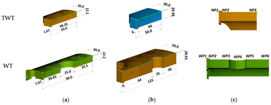 Specimen and grip assembly dimensions for FE analysis (unit: mm): (a) TWT; (b) WT.