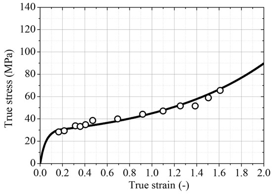 The true stress–strain data of PE100 utilized for the FE analysis is shown in Figure 13. The true stress–strain data up to the onset necking was estimated from the nominal stress–strain data using Equations (1) and (2). An exponent value of n = 1.25 was chosen as it gave an optimal curve passing through the true stress and strain data points (open circles) obtained from the real-time experimental measurement of the cross-sectional area and the length change during the tensile deformation, as shown in Figure 13. The independent elastic constants (i.e., E = 1.1 GPa, σy = 18.5 MPa, εy = 0.03037, and ν = 0.45) were used to describe the elastic part. The plastic part after the yield strength was tabulated from the fitted true stress–strain curve.