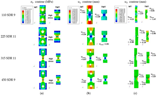 Figure 14 illustrate the contours of von Mises stress (, axial displacement (), and transverse deflection () at the maximum reaction force, Fmax. The axial stress ( and of 110 SDR 9, 225 SDR 11, 315 SDR 11, and 450 SDR 9 TWT and WT specimens at Fmax are also shown in Figure 15, Figure 16, Figure 17 and Figure 18, respectively. Table 8 and Table 9 provide selected , and values at different locations along the specimen axis, as shown in Figure 12.