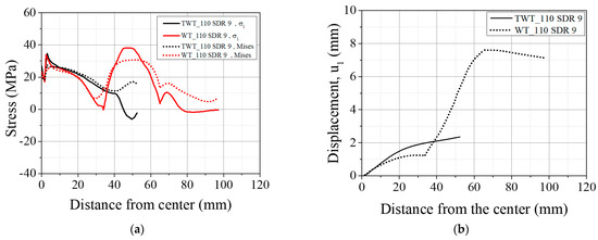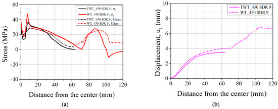 FEA results of Type B, 450 SDR 9 TWT and WT specimens at Fmax: (a) and ; (b) .