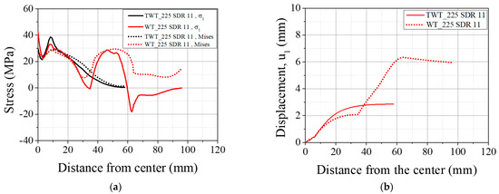 FEA results of Type A, 225 SDR 11 TWT and WT specimens at Fmax: (a) and ; (b) .
