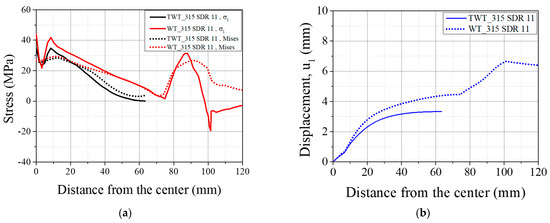 FEA results of Type B, 315 SDR 11 TWT and WT specimens at Fmax: (a) and ; (b) .