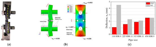 By comparing Figure 19 ( with Figure 20 (, one can observe that the excessive transverse deflection in 110 SDR 9 WT specimen brings about large specimen displacement. This is speculated to be due to the lower stiffness of the thinner 110 SDR 9 size compared to other larger sizes. However, with the TWT specimen, such large transverse deflection is not observed in 110 SDR 9 size, which indicates the stability of the specimen under the tensile test. As the specimen gets larger, the difference in (Figure 19) and (Figure 20) between TWT and WT gets smaller, indicating that a comparable load–displacement behavior to Fmax can be expected to occur. This is experimentally shown in Figure 21b, where the difference in displacement at Fmax becomes smaller with larger specimen sizes.