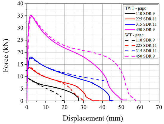 A comparison of load–displacement between the TWT and WT specimens is shown in Figure 23. They are practically identical up to the point of onset necking. And similar to the crosshead load–displacement behavior, the total displacement measured is dependent on the specimen type. With Type A specimens (110 SDR 9 and 225 SDR 11), the TWT displacements are larger than the WT displacements and smaller when Type B (315 SDR 11, 450 SDR 9) are compared. The deviation in the load–displacement curve after the onset necking is seen to occur at the smallest displacement for 110 SDR 9 (TWT-20 mm notch versus WT-10 mm diameter notch), followed by 225 SDR 11 (both are 20 mm diameter notch). For Type B specimens, TWT (20 mm parallel side) and WT (25 mm parallel side) showed more or less the same behavior throughout the necking region up to a 20 mm displacement.