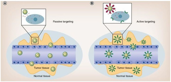 Schematic of passive (A) vs. active (B) targeting in cancer diagnostic, imaging and therapy. Reproduced with permission from ref. [61]; Boateng et al., Int. J. Mol. Sci. 21 (2020) 273. (open access Creative Common CC).