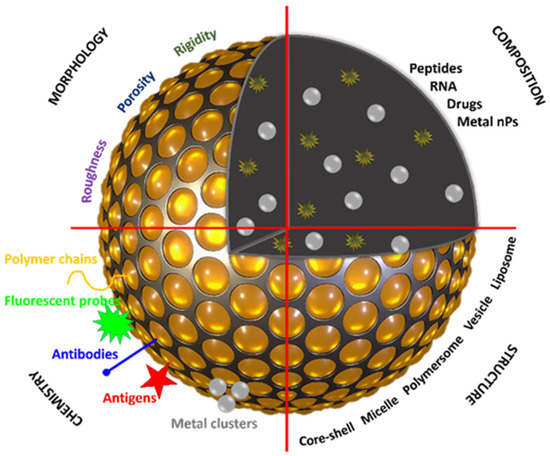 Based on the above, the PNPs might be presented using the concept of multifunctional “lego” particles, which structure, composition, morphology and surface can be on-demand adapted to act in diagnostics, imaging and even treatment of cancer [22] (Figure 2). To conclude, the structural, physical and chemical versatility and tenability of the polymeric nanocarriers, which are capable of loading various types of anticancer therapeutic agents, constitute an interesting building block platform for the construction of nanoclusters-based DDS.