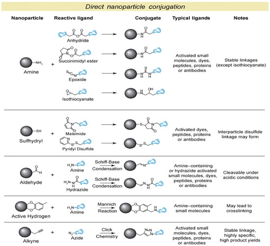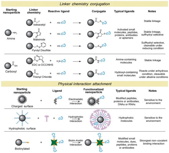 The possibility to incorporate a functional group on the SPION’s surface is essential for their stabilization, cytotoxicity, target and application. So far, several studies have examined the potential cytotoxic effect of the SPIONs with different surface coatings, generally showing no or low toxicity until high exposure levels (>100 µg mL−1) [187,188,189]. High exposure level of SPIONs can lead to oxidative stress, DNA damage and changes in the gene expression. Therefore, is it extremely important to select a surface coating capable of stabilizing the SPIONs until they are cleared from the body [190,191,192]. First, the surface coating with desired functional groups can prevent their aggregation and cytotoxicity and can provide binding sites for further conjugation with the pharmaceutical agent or targeting ligand. Stabilization of the NPs mainly achieved by electrostatic forces or steric repulsion and by controlling the strength of these forces is the key parameter to obtain NPs with a good stability for biomedical applications. The most common primary functional groups adsorbed or attached on the SPIONs surface include carboxylic groups (e.g., alginate (ALG), polyacrylic acid (PAA), and citrate), amine groups (e.g., polyethyleneimine (PEI), CHIT) and hydroxyl groups (e.g., PEG, polysaccharides, ALG) [193]. Another way of coating SPIONs is by using inorganic materials such as Au, silica or gadolinium, which in turn can enhance the nanoparticle properties and help in binding biological ligands. Lin et al. synthesized a core-shell structure of Fe/Au NPs with a 10 nm size by a reverse-micelle approach [194]. In another example, Caro et al. synthesized Au coated SPIONs and capped with PVP (Fe@Au NPs) by a seed-mediated growth chemical method. In the study, the NPs showed a multimodal activity as contrast agents for MRI, X-ray CT and as possible image-guided PTT, thus indicating the potential development of the platform as theranostics agents [195]. Similar strategies to Au and Ag NPs are employed for the surface functionalization and stabilization of the SPIONs and are depicted in Figure 3. Overall, the conjugation efficiency will be variable depending on the surface chemistry of the NPs, and sometimes the biomolecules require modification in order to be reactive for conjugation. This is mostly the case for direct NP conjugation, and in turn loss of bioactivity can occur [196]. For example, a new approach implicates the use of “click” chemistry, which involves Copper (Cu)-catalyzed azide-alkyne chemistries [197]. Both groups are highly reactive towards each other and are unreactive with most functional groups, allowing for the specific conjugation with the desired moiety with a highly stable bond. Even though the implementation of “click” chemistry allowed for a direct conjugation of SPIONs with a biomolecule, there are some limitations. First, the Cu catalyst can lead to problems in vivo if it is not properly purified beforehand, as excessive consumption of Cu was linked to disorders such as kidney disease, hepatitis and Alzheimer’s [198]. Second, the highly stable bond between the SPIONs and biomolecules may also inhibit the further degradation of the magnetic NPs and be secreted from the body. Therefore, the method for conjugation with a biomolecule mainly involves the modification of the SPION’s surface with a proper functional group that contains a linker that can directly be attached between both moieties. The linker chemistry conjugation has a better control over the binding sites since it can increase the number of active biomolecules at the nanoparticle surface and the milder reactive conditions limit the loss of bioactivity during the conjugation. Finally, another way to achieve interactions between a biomolecule and the SPIONs is by applying physical forces based either on electrostatic interactions, hydrophobicity/hydrophilicity or affinity (e.g., avidin-biotin) interactions. The advantages when using this approach include no need for an intermediate modification step and high and rapid binding efficiencies. For example, electrostatic interactions have been used for the assembly of plasmid DNA onto SPIONs, where the SPIONs were coated with cationic PEI and then complexed with the negatively charged plasmid DNA [199,200]. While hydrophobic/hydrophilic interactions have remained unattractive for conjugation with a biomolecule due to the sensitivity of the SPIONs to the environmental conditions and low orientation of the bound ligands, affinity interactions have shown to be very effective for bioconjugation. For example, the SPION’s surface can be modified with streptavidin, which will specifically bind to any biontinylated molecules [201]. Unlike the electrostatic and hydrophobic interactions, the affinity interaction is the strongest non-covalent bond and does not suffer from environmental conditions such as salinity or changes in pH [179]. As the SPIONs systems have the possibility to be coated with diverse polymers and materials, they are capable of interacting not only with biomolecules but also with any desired drug and they can act as magnetic nanocarriers for drug delivery. The strategies for conjugation are similar to the one used for bioconjugation and can overall be represented in Figure 3.