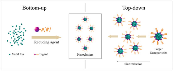 Metallic nanoclusters (MNCs) are nanosystems composed of a few to a hundred atoms. They display molecule-like features since their size (below 2 nm) is close to the Fermi-wavelength of electrons (c.a. 0.7 nm) [206]. Owing to their discrete energy levels, MNCs have radically different chemical, optical and electrical properties from those of bigger metal NPs. A distinct characteristic of the MNCs is their strong photoluminescence, ease of synthesis, tunable fluorescence emission, very large surface-to-volume ratios, good quantum yields, high photostability and large Stokes shift [207]. Luminescence properties of the MNCs can be controlled using several approaches, such as ligand-to-metal electron transfer, quantum confinement effects, controlled surface complexation, ligand-controlled formation of super-cluster architectures and via agglomeration induced emission between clusters protected by thiolate [208,209,210]. MNCs formed from Au and Ag have been widely explored for applications in the biomedical field for bioimaging and biolabeling [206,211]. Therefore, for the MNCs to be applied as successful tools, it is highly important to assemble a biocompatible and reliable platform to achieve the required performance. Biocompatibility is a key parameter for the short and long-term interaction with the patient, as when the MNCs are injected into the organism, they can potentially harm the host and trigger an immunological response that could lead to toxicity. To reduce and avoid the possibility of a negative response, coating and functionalization of the metallic core and coating with a non-toxic shell can improve its biocompatibility while keeping their intrinsic properties. The general approach for achieving proper functionalization for the MNCs is either by the “top-down” or “bottom-up” method (Figure 4). The most common method of synthesis is very similar to the preparation of inorganic NPs such as chemical reduction, chemical etching, photoreduction, electrochemical synthesis, sonochemical synthesis and microwave assisted synthesis [206,212]. The most widely used methodology is the chemical reduction of the metal salts in the presence of organic ligands as the stabilizing agents. To control the size of the MNCs and obtain ultra-small MNCs, three essential features need to be considered, namely a strong stabilizing effect that can be obtained by ligands with a large steric hindrance, a high metal binding affinity between the ligand and metallic core and a weak reducing power coming from the reducing agents. For instance, Au NCs can be assembled in-situ using thiols as protecting ligands. This approach consists of the chemical reduction of the Au ions into Au0, followed by their nucleation in the presence of capping and reducing agents (e.g., NaBH4 and tetrakis (hydroxymethyl) phosphonium (THP)) [213]. The array of substituents will influence the arrangement of the Au atoms and hence the NC’s core due to the volume and properties of the ligand [214]. The presence of thiols is often used because they can form strong thiol-Au bonds with a similar strength as Au-Au bonds and they have good water solubility and high stability. Many thiols have been used to prepare monolayer-stabilized Au NCs and Ag NCs, such as glutathione (GSH), thiolate cyclodextrin and tiopronin [215,216]. Besides thiols as capping agents, biomolecules and polymers have gained attention in the chemical reduction process due to their minimal toxicity and higher biocompatibility [213]. For example, several studies were performed to synthesize luminescent Ag NCs using various DNA sequences [217]. Ag NC’s functionalization using DNA helps prevent the Ag NCs from aggregating and allows a distinct recognition ability for biomarkers in the cells, e.g., integrating the DNA tail with some aptamers to attain specific binding and cell targeting [218]. The main advantages for these Au NCs and Ag NCs have been explored in the field of biosensing and biolabeling thanks to their fluorescent properties. Lately, they have gained more attention in therapeutic applications (e.g., radiotherapy and photodynamic therapy) as a new strategy to elude drug resistance [219,220,221]. For example, in radiotherapy, ionization energy is used for the killing of cancer cells. However, as a high energy is employed, healthy tissues can be also affected, which constitutes a major obstacle of this method. Therefore, the need for materials that can be localized in the tumor and be used as radiosensitizers are now being considered. Since Au has a high atomic number (Z = 79), it can have an enhanced radiation effect [222]. The use of Au NCs as radiosensitizers can be an advantage since they can strongly absorb a radiotherapy ray and yield the secondary electrons once irradiated with gamma or X-rays [223]. It was reported by Zhang et al. that Au NCs synthesized using glutathione as a coating agent can accumulate in the tumor by the EPR effect, and thus enhance the efficacy of the radiotherapy [224,225]. The potential photochemical activity of Au NCs on cancerous cells was lately explored. Cifuentes-Rius et al. synthesized protein-stabilized Au NCs as potential photodynamic agents, which displayed cell uptake even after 24 h of administration This induced cell death throughout this period via the production of ROS, including singlet oxygen, which plays a key role in the photodynamic therapy as damaging cellular factors after their irradiation with NIR light [226]. The application of Ag NCs as tools in photodynamic therapy have been also explored. For instance, in a study by Yu et.al, bovine serum albumin (BSA) protein templated Ag NCs exhibited a stronger singlet oxygen generation than their Au NCs analogue. These Ag NCs were tested on MCF-7 breast cancer cells where they showed good uptake and the cancer cells were killed by the irradiation of white light [221]. Overall, MNCs offer an excellent, versatile and multifunctional platform for developing col