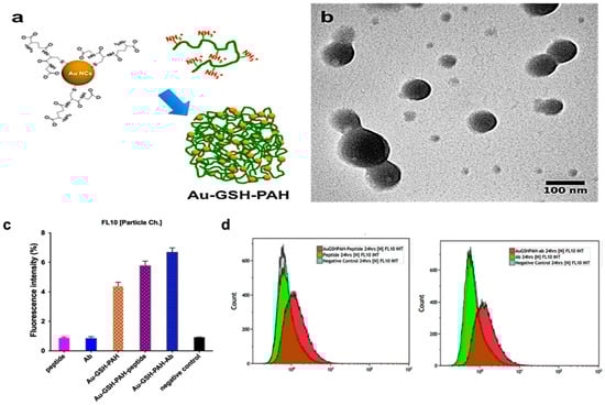 In a different study, Khandelia et al. reported the preparation of Au NCs embedded with BSA (composite NPs) and the anticancer drug (DOX) [245]. The DOX loaded composite NPs demonstrated toxicity against the cancer cells (i.e., HeLa cells) while retaining their luminescence in the blood serum. Zhou et al. also synthesized Au NCs as theranostics agents while combining them with an anticancer drug (i.e., cisplatin pro drug) and FA [246]. They demonstrated the capacity of the multicomponent nanoclusters to inhibit the growth and metastasis of the breast cancer cells while exhibiting fluorescence imaging with a strong signal due to the targeting effect of the FA. Ammar et al. developed a strategy of preparation of multi-component nanoclusters based on assembly via electrostatic interactions of MNCs [247]. They synthesized Au NCs with sizes of about 100–150 nm by self-assembly. The Au NCs stabilized with GSH (Au-GSH) were used as precursor along with a cationic polymer poly (allyl amine hydrochloride) (PAH) for the self-assembly of the NPs. It was possible to form the NPs without significant aggregation thanks to a proper control of the electrostatic interactions between the Au NCs and the polyelectrolyte. The self-assembled NPs were loaded with fluorescent biomolecules (e.g., peptide or Ab) to demonstrate the drug delivery capability using a single-step reaction and determine the colocalization of the NPs and biomolecules after incubation. The loaded NPs with either peptide or Ab led to an enhancement in fluorescence as compared to their free counterparts, (Figure 6).