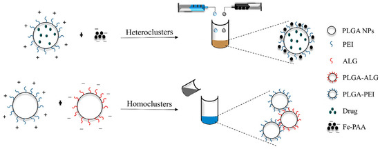 Besides the MNCs-based multicomponent and multifunctional systems, hierarchical nanostructures prepared by supramolecular assembly of building blocks (e.g., organic NPs, inorganic NPs, biomolecules, and drugs) using well-known approaches including hydrophobic interactions or electrostatic interactions of oppositely charged entities were reported in the literature. Following this concept, our group developed a simple and versatile methodology consisting of supramolecular assembly via electrostatic interactions of oppositely charged inorganic and drug loaded PNPs to construct controlled multicomponent and multifunctional nanoclusters [261,262]. Specifically, the nanoclusters were constructed by supramolecular assembly through electrostatic interactions of oppositely charged SPIONs and drug loaded PLGA NPs (Figure 7). It was demonstrated that by a dropwise approach (slow and progressive addition of one component into another), clusters in the nanometer range regardless of the ratio between the primary NPs were formed. This new methodology can be applied for the development of nanoclusters combining multiple functionalities such as imaging, targeting, therapy and drug delivery to fight cancer. Similarly, Haša et al. prepared multicomponent nanoclusters by electrostatic interactions of negatively charged liposomes, SPIONs and positively charged poly L-lysine (PLL) [263]. The control of the nanoclusters’ size and structure was dependent on the order of addition of the components. First, SPIONs were incorporated into the liposomes. Then, the SPIONs-liposomes were introduced into PLL solution. The formed nanoclusters were stabilized by adding an excess of SPIONs to block any remaining positive charge from PLL, and hence inhibit their increment in size. The liposomes clusters showed the advantage of encapsulating independently different drugs (e.g., resazurin and vitamin C) into the liposomes, while the addition of SPIONs allowed the stabilization of the final size of the clusters, and their presence can be used for a controlled release by applying a magnetic field [263].