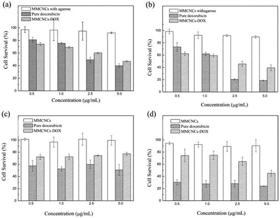 (a,b) Survival of SGC7901 cells in four different concentrations of the MMCNCs, pure DOX, and MMCNCs-DOX after incubation with cells for (a) 24 and (b) 48 h. Graphs were plotted with DOX concentrations of 0.5, 1.0, 2.5, and 5.0 μg mL−1. c, d) Survival of HEK 293T cells in four different concentrations of the MMCNCs, pure DOX, and MMCNCs-DOX after (c) 24 and (d) 48 h of incubation. Graphs were plotted with DOX concentrations of 0.5, 1.0, 2.5, and 5.0 μg mL−1. Reprinted with permission from ref [267]; Li et al., Small 8 (2012) 2690–2697, Copyright (2012) John Wiley and Sons Inc.