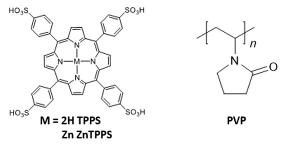 Chemical structures of 5,10,15,20-tetrakis-(4-sulfonatophenyl) porphyrin (TPPS), its zinc complex (ZnTPPS), and polyvinylpyrrolidone (PVP).