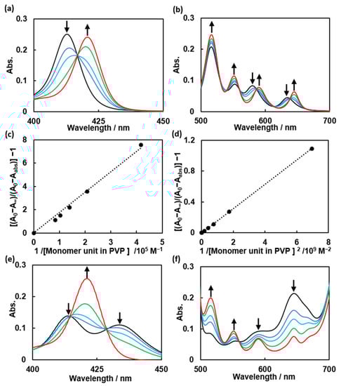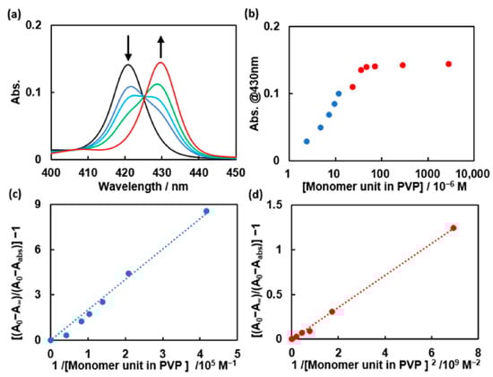 The absorption spectra of TPPS in the presence and absence of PVP were also recorded in 0.01 M phosphate buffer (pH = 8.0). Redshifts in the Soret band and Q-bands were observed (Figure 3a,b, Figures S6 and S7), suggesting the formation of a complex between TPPS and PVP (TPPS–PVP complex). The corresponding BH plots were constructed in the same manner as those for the ZnTPPS–PVP complex (Figure 3c,d).The BH plots indicate that the TPPS–PVP complex formed at ratios of 1:1 (TPPS:PVPmonomer unit) and 1:2 in the lower and higher PVP concentration regions, respectively. The association constants were calculated to be K1,T = 5.0 × 104 M−1 and K1,T × K2,T = 5.0 × 109 M−2.