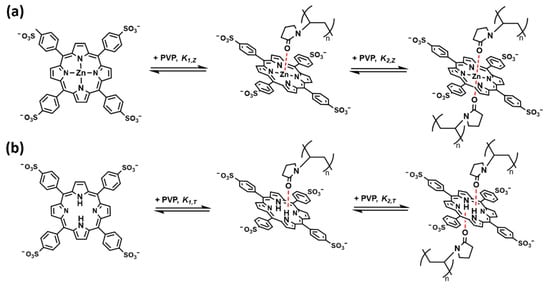 (a) Conceptual schemes of the formation of the ZnTPPS–PVP complex; (b) Conceptual schemes of the formation of the TPPS–PVP complex.