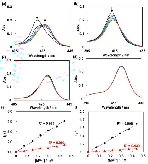 In the presence of MV2+, ZnTPPS and TPPS can both form donor–acceptor pairs []. When MV2+ was added to TPPS or ZnTPPS, redshifts were observed in their absorption spectra (Figure 5a,b). After PVP was added to a TPPS or ZnTPPS solution, negligible peak shifts were observed upon the addition of MV2+ (Figure 5c,d). These results suggest that the ground-state interactions between the porphyrin and MV2+ were restrained. We observed the fluorescence quenching of ZnTPPS (Figure S13) and TPPS (Figure S14) by MV2+ in the presence and absence of PVP, excited at the isosbestic point, to investigate the electron transfer between the porphyrins and MV2+. Referring to the fluorescence intensity of spectra vertices Stern–Volmer (SV) plots for the quenching of the emission of the porphyrins were constructed (Figure 5e,f). Although the SV constant (Ksv) decreased after the addition of PVP (KSV, ZnTPPS–MV: 7.1 to 1.6, KSV, TPPS–MV: 1.6 to 0.2), fluorescence quenching phenomena were actually observed.