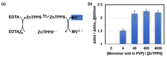 (a) Scheme showing the generation of MV+• from MV2+ via electron transfer from photoexcited ZnTPPS (*ZnTPPS) with ethylenediamine-N,N,N′,N′-tetraacetic acid tetrasodium salt (EDTA) as a sacrificial agent; (b) Increase in the ratio of generated MV+• in the presence of PVP compared with that in the polymer-free case.