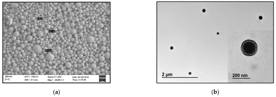 (a) SEM and (b) TEM images of the MK-2048-loaded PNPs. Scale bars are shown on each image. The TEM image consists of two scales with a close-up of one PNP inserted.