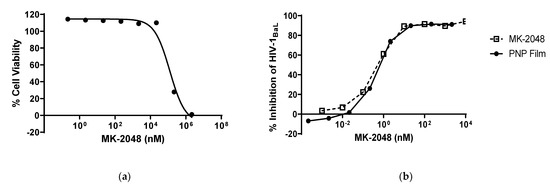 Cytotoxicity of MK-2048-loaded PNP film was evaluated in TZM-bl cells. Cells were seeded in a 96-well plate at 1 × 104 cells/well overnight. Films were dissolved in 1 mL saline solution and serial dilutions of film solution were incubated with TZM-bl cells at 37 °C in 5% CO2. After 48 h luminescence was measured using CellTiter-Glo (Promega, Madison, WI, USA). The % viability of cells treated with film solution was calculated by comparing luminescence of film-treated cells to that of cells without any treatment.