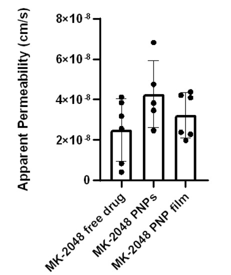 The long-acting effect of the PNP films was hypothesized to be achieved by sustained drug release and evasion of transporters. Integrase inhibitors such as raltegravir and elvitegravir are substrates of efflux transporters existing in the vaginal tissues, namely P-gp and BCRP [22,23,24,25]. The second-generation integrase inhibitor, MK-2048, was also identified to be a substrate of efflux transporters. Therefore, in vitro bi-directional cell assays demonstrated higher ERs for free MK-2048 compared to MK-2048 PNPs, indicating that nanoparticles can potentially evade the transporters. This evading effect was also partially demonstrated in the ex vivo study where MK-2048 permeability was increased by 1.7- and 1.3- fold for the PNPs and PNP films, respectively.