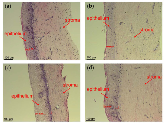H&E staining for the morphology of human cervical tissues: (a) pre-treatment, (b) post-treatment with free MK-2048, (c) post-treatment with MK-2048 PNP, and (d) post-treatment with MK-2048 PNP film. Epithelium thickness was measured as shown in respective images. Nuclei were stained in blue.