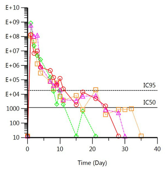 In vivo drug delivery profiles of MK-2048 PNP films (containing 10 mg MK-2048) in vaginal fluids. For numbers in the y-axis larger than 1000, E + n means 1 × 10n. Films inserted on Day 0. The solid line indicates the IC50 of MK-2048. The dash line indicates the IC95 of MK-2048 [38].