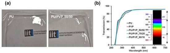 The waterborne aliphatic polyester PU forms a transparent film that can be peeled off easily from polystyrene Petri dishes (Figure 1a, left panel). Similarly, the waterborne PU could be mixed with the PVP solution at any ratio, forming transparent hybrid films, see for instance Figure 1a (right panel). Particularly, the PU/PVP hybrids were very interesting and completely transparent as shown in Figure 1b. The transmission exceeds 90% at around 350 nm, indicating that the films are transparent starting from the UVA and UVV wavelengths (320–400 nm) to the visible red range (~740 nm). All the films block transmission of far UVC light (207 to 222 nm) that is considered to be an important wavelength range that efficiently kills pathogens potentially without harm to exposed human tissues []. In fact, between 300 to 400 nm, the hybrid films display slightly better transparency compared to the pure PU film, as shown in Figure 1b.