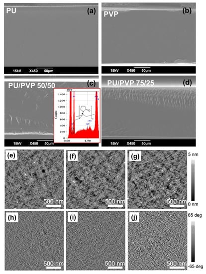 SEM cross section images of (a) pure PU film, (b) pure PVP film, (c) PU/PVP_50/50 hybrid film and (d) PU/PVP_75/25 hybrid. AFM height and phase images for PU/PVP_90/10 (e,h), PU/PVP_75/25 (f,i) and PU/PVP_50/50 (g,j).