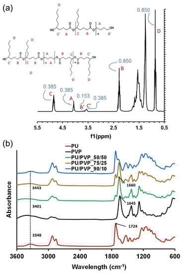 FTIR-ATR analysis was used to identify potential changes in the functional groups upon the hybridization of PU and PVP polymers. The C=O and N–H groups present in PU can form a hydrogen bonding interaction with polar groups of PVP. As shown in Figure 3b, the bare PU was characterized by a peak at around 3348 cm−1 due to the existence of the N–H stretching vibration. The carbonyl absorption peak located at 1724 cm−1 can be attributed to a free carbonyl stretching vibration. In the case of PVP, the hydroxyl peak can be seen at 3401 cm−1. Upon hybridization with PVP, a new peak appeared at 1650 cm−1 in all the hybrids, which corresponds to the typical carbonyl group in the pyrrolidone ring of PVP. The hydroxyl (O-H) group shifting from 3401 cm−1 of PVP to 3443 cm−1 for PU/PVP 50/50, indicates that the hydrogen bonding interactions in the blends are strong, as shown in Figure 3b. The FTIR data do not indicate the formation of new polymers but suggest the presence of some covalent and hydrogen bond interactions such as the peaks near 1650–1660 cm−1 related to amide-lactam interactions of RCONNR2 type and signal shifts in the region 3300–3450 cm−1.