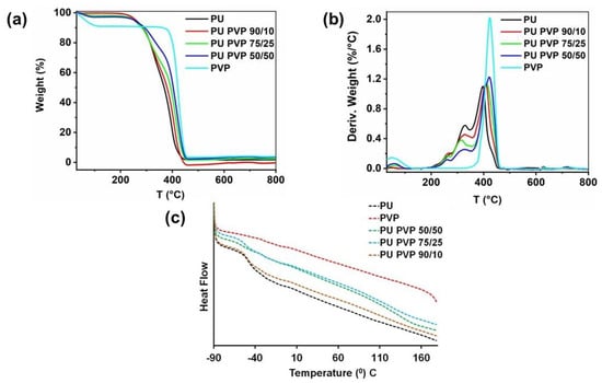 The thermal degradation of the pristine polymers and the hybrids was studied by thermal gravimetric analysis (TGA), as shown in Figure 4. The hygroscopic character of PVP polymer is evident in Figure 4a, in which about 8% adsorbed water loss was measured until the system temperature reached 100 °C. Pure PU displayed no hygroscopic features and demonstrated the onset of degradation temperature at 395 °C, while PVP demonstrated this at 425 °C. As Figure 4b indicates, the PU polymer has a minor weight loss temperature of about 325 °C. It is generally known that the derivative TGA curves of polyurethanes show several different degradation stages between 220–370 °C. The range 230–340 °C is associated with the degradation of the hard phase (crosslinks); and the range 350–370 °C indicates dissociation of the soft segments. The onset of degradation temperatures of PU/PVP hybrids was observed at 422, 410, and 408 °C for 50/50, 75/25, and 90/10 PU/PVP hybrids, respectively. Thus, it can be stated that PVP improved the thermal degradation resistance of the PU polymer. Figure 4c shows the differential scanning calorimetry (DSC) thermograms of PU, PVP, and the hybrids. The curves indicate that the glass transition temperature (Tg) value for the pristine PU was found to be −47.3 °C, while PU/PVP hybrids exhibited Tg values of −49.2 °C, −52.8 °C, and −57.1 °C for PU/PVP_90/10, 75/25, and 50/50 samples, respectively. This indicates that the Tg of PU/PVP blends gradually decreased with the increase in PVP content, indicating more molecular mobility within the hybrid films.