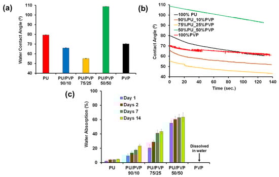 The surface hydrophilicity of the films, including the pure polymers, was analyzed by static and dynamic water contact angle measurements as shown in Figure 6a. The pure PU film exhibited a contact angle of 79.4 ± 0.20, indicating a relatively hydrophobic nature. On the pure PVP film, the contact angle was measured to be 70.2 ± 0.50. The hybrid films PU/PVP_90/10, and PU/PVP_75/25 exhibited lower contact angles and were more hydrophilic than the respective pure polymers, as shown in Figure 6a,b. In the case of the PU/PVP_50/50 hybrid film, the contact angle was much higher at 110°. This indirectly suggests that the polymers interact with strong hydrogen bonds, leaving no interacting polar groups on the surface of the films. Similar systems were also reported earlier, in which two hydrophilic polymers were hybridized, thereby forming hydrophobic composite films []. The dynamic water contact angle measurements reported in Figure 6b show that the contact angles change slightly over a period of 2 min under ambient conditions which can be attributed to the evaporation of the droplets rather than droplet absorption into the film or a sudden change in wetting state []. Separately, the water absorption tests for all the films that extend to a two-week period are reported in Figure 6c. The pure PU film was very stable and its water uptake remained below 5% compared to pure PVP that completely dissolves in water after a couple of hours. Increasing the PVP content in the films increases the water uptake values gradually up to about 60% for the PU/PVP_50/50 hybrid film at the end of the 14 day period. No dissolution whatsoever was observed at the end of the measurements that proves the formation of an interacting blend between the PVP and PU polymer chains.