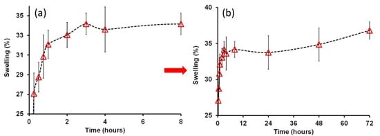 We chose the PU/PVP_50/50 film in order to conduct further tests such as swelling and to detect changes in its mechanical properties as a function of wet–dry cycles when the film is immersed in water. Figure 7a shows percent swelling in the film as a function of water immersion time in hours. The maximum swelling occurred at around at 34% after 4 h in water. Monitoring further changes in percent swelling up to 3 days continuously, as shown in Figure 7b, designates that the percent swelling does indeed saturate at around 35% and does not change any further when immersed in deionized water. Moreover, as seen in Figure 7, the films do not transform into a hydrogel state, since the degree of swelling in hydrogels can be in excess of 1000% [].