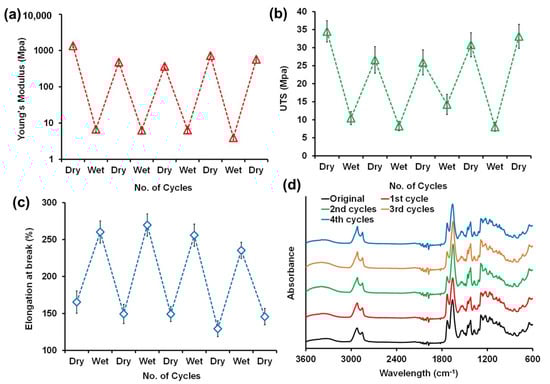 Mechanical properties of PU/PVP_50/50 film in response to wet–dry cycles. (a) Changes in elastic modulus, (b) changes in UTS, (c) changes in elongation at break values and (d) FTIR spectra after each wet–dry cycle indicating no chemical changes in the film due to cycling tests.