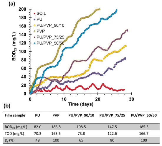The biodegradation potential of the films including the pure polymers and the organic garden soil were tested using the OxiTop Control S6 apparatus to understand susceptibility of the films to home compost-like conditions. The sample films that weighed about 200 mg were monitored for 28 days. The amount of dissolved oxygen needed by aerobic biological organisms to break down the film samples is plotted in Figure 9a. The BOD value is most commonly expressed in milligrams of oxygen consumed per liter of sample during the whole incubation period in the bottles. The final BOD values were registered for each film at the end of 28 days. The mass shares of carbon, hydrogen, and oxygen for each polymer/polyol were estimated based on am elemental analysis/polymeric structure of each polymer and the results are tabulated in Figure 9b. The estimates were used to calculate the theoretical oxygen demand TOD (mg/L) and the percent degradation of each film (Dt, %) in Figure 9b. The results are quite encouraging and even the pure PU film displays a 50% degradation rate at the end of roughly one month of testing. In fact, the measured BOD values in Figure 9b were higher than the TOD values for all films tested. This suggests that the degradation of the films can positively affect the aerobic microorganism (organism proliferation) growth in the testing system [,]. It is important to note that this test does not exactly indicate that the films are completely biodegradable, since it does not replicate many different environmental conditions; however, it shows the susceptibility of the films to biodegradation that is found to be quite high. Further tests that comply with home and industrial compost standards need to be conducted.