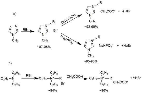 Ionic liquids used in this work were obtained by a typical two-step method involving quaternization of imidazole or amine followed by anion exchange [15]. The general scheme of the reaction is presented in Figure 1.