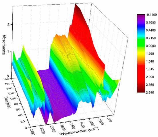 During the glycerin oligomerization reaction, its progress was monitored by in-situ recording of the FTIR spectra of the reaction mixture. The set of spectra obtained over time of glycerol oligomerization catalyzed by the ionic liquid [C12-mim][OAc] is shown in Figure 4.