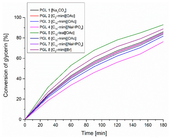 In the last dozen or so years, ionic liquids include new, more effective, and less toxic catalysts. Additionally, they are characterized by quite good thermal stability, and it is possible to reuse them in subsequent reaction stages. Ionic liquids containing an imidazolium cation are used, inter alia, in in C–O bond opening reactions in epoxides, in alcohol etherification reactions with alkyl chloride in phase transfer catalysis (PTC), and in alcohol-alcohol etherification [13,14,15,16,17,18,19]. Moreover, the use of ammonium acetates in the etherification reactions of propylene oxide with alcohols leads to more selective products [15]. Taking the above into account, it seemed advisable to evaluate the possibility of using imidazolium and ammonium ionic liquids as homogeneous catalysts for glycerin oligomerization. It should be emphasized that there is no information in the literature on the use of ionic liquids as catalysts for the synthesis of oligoglycerols