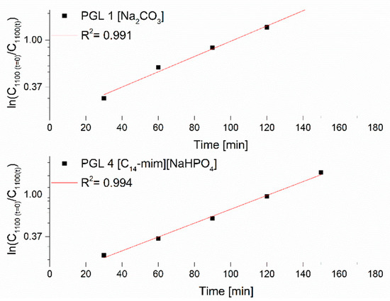 Using Equation (4), plots are plotted in a semi-logarithmic system of the corresponding absorbance ratio of the C–O–C ether group stretching band at 1100 cm−1 wavenumber as a function of time for a sodium carbonate catalyzed oligomerization reaction and an exemplary ionic liquid [C14-mim][NaHPO4]. As can be seen, rectilinear relations were obtained, with the correlation coefficient R2 > 0.9 (Figure 6).