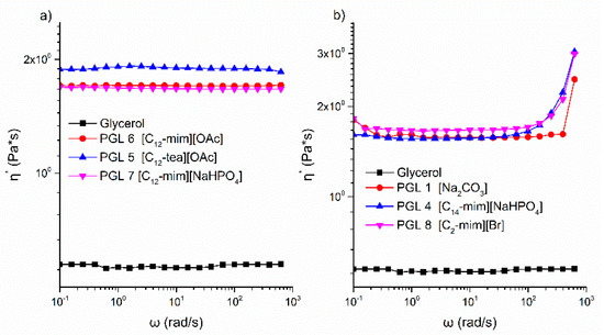 Figure 9. Graph of the dependence of the complex viscosity on the angular frequency of shear at 30 °C for the obtained oligoglycerols with the use of ionic liquids (a) Newtonian liquids (b) non-Newtonian liquids.