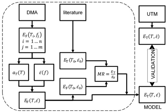 The procedure began with the DMA experimental data (storage and loss moduli) over input parameters (amplitude, frequency, and temperature). Once these data were measured, with the use of the proposed mathematical model, tensile moduli were estimated at different temperatures and frequencies. Finally, these estimated values were compared to tensile tests in order to validate the material model.