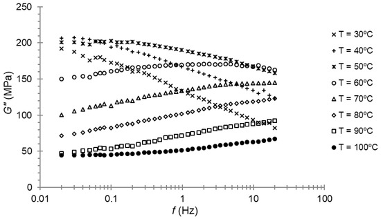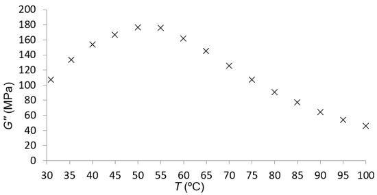 At first, the maximum of the loss modulus for 1 Hz of frequency was seen, as expected, at a temperature close to 50 °C; that is, the temperature at which the maximum of the loss modulus was found during the temperature sweep. When examining Figure 6, it can be seen that the maximum was reached between 40 and 50 °C for a lower frequency.