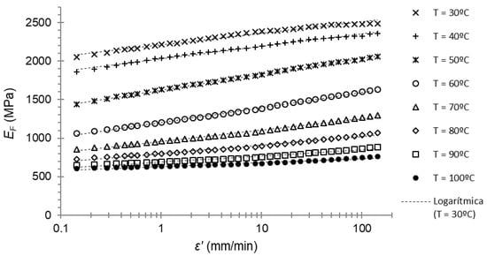 The first step was the calculation of the flexural modulus at one specific temperature for the reference strain ratio . In our case, . This could be calculated through linear interpolation from experimental data of the storage modulus. However, in order to construct the general model from the DMA tests, we calculated the slope of the logarithmic adjustment of the flexural modulus as a function of the strain rate (SEF) at a reference temperature (in our case, at 30 °C).