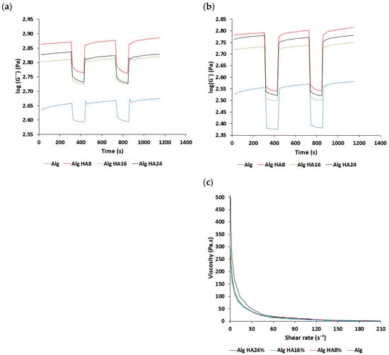 Rheological characterization of alginate-HA inks: (a,b) Time variation of storage and loss moduli and (c) overall viscosity variation with respect to the shear rate for different alginate-HA ink formulations.