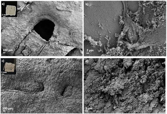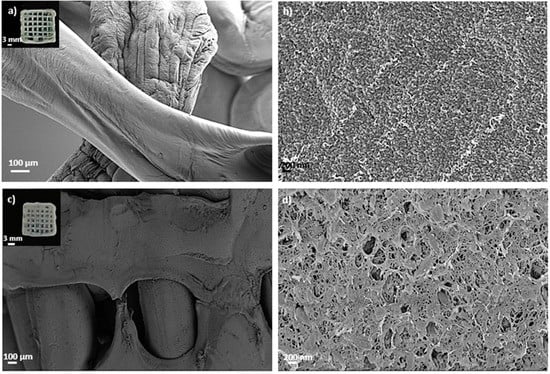 SEM images of 3D-printed and aged aerogel scaffolds prepared from alginate 6 wt.% and HA 16 wt.% inks (c,d) with and (a,b) without GA post-crosslinking step. All formulations were crosslinked with GA vapor. Aerogels were observed at two different magnifications. Intake in (a,c): visual appearance of the aerogel scaffolds with a well-defined 3D-pattern.